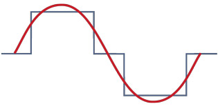 In contrast to so-called square wave or trapezoidal inverters (blue square curve), Steca sine wave inverters produce a real and precisely controlled sinus wave (red sinus wave) at their output. The sinus wave inverters offer the security that all loads which are suitable for grid operation can also be operated on a stand-alone system without any problems. Furthermore, they offer the advantage that no significant noises are produced in the inverter and there is no loud background noise to be heard on a connected radio, for exampl.