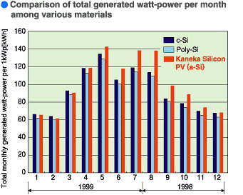 *Kaneka Silicon PV's generated watt-power is approximately same as that of other crystalline silicon PVs during the winter months, but in summer the Kaneka Silicon PV generates significantly more power compared to other crystalline silicon PVs.