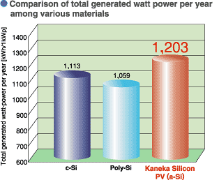 Kaneka's amorphous silicon PV module (a-Si) has superior light absorption per nominal watt power. Compared with mono-crystalline silicon PV modules (c-Si) or poly-crystalline silicon PV modules (poly-Si), it generates considerably more power per nominal watt power.