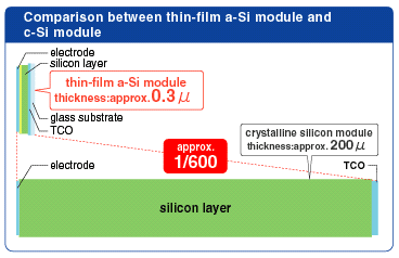 The thickness of a-Si cell is 0.3, which is 1/600 of that of crystalline silicon cell (approx. 200).
