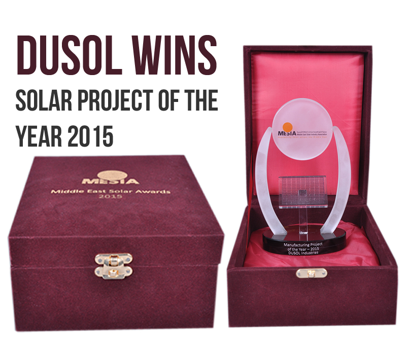 We are delighted to inform that DUSOL has WON manufacturer of the year - 2015 - award for SOLAR PV production in DUBAI. The award was adjudicated by a panel of 8 world renowned individuals within the solar industry under aegis of MESIA (Middle East Solar Industry Association). It is good to know that the industry notices the efforts of DUSOL and believes in them.