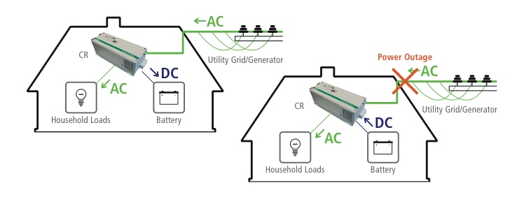 Places with erratic power supply with outages lasting over hours or even days, a power backup solution is used. It comprises of AC to DC to AC inverter/charger. When the supply is available, Inverter/charger supplies power to the home as well as charges the batteries. Upon outage of power, the charged batteries are used for powering the home appliances through the inverter.