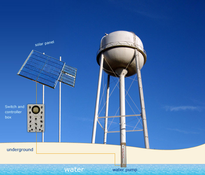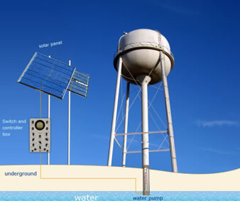 Solar panel: Converts sun light into electric current. Rated in terms of peak watts produced. Solar water pumping system requires anything from 160 W to 1200 W depending on the required lift and require flow.